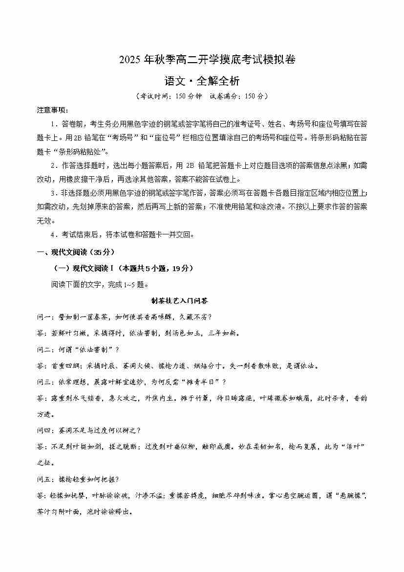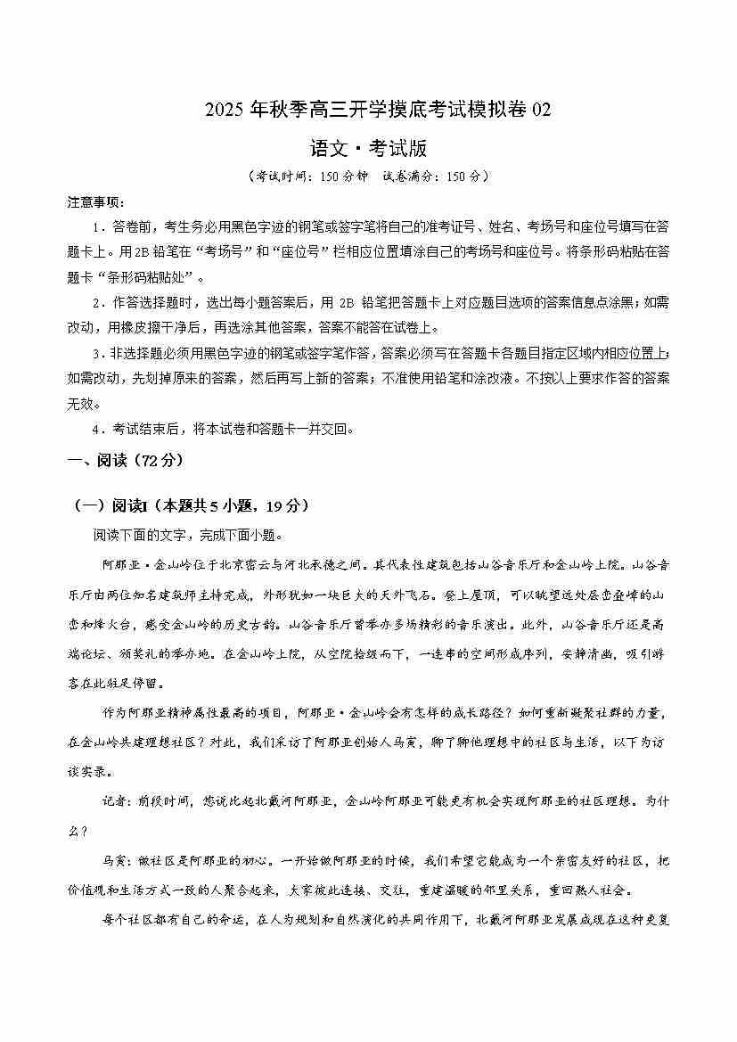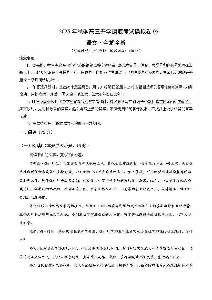 高三语文开学摸底考02(考试版A4)全国二卷通用