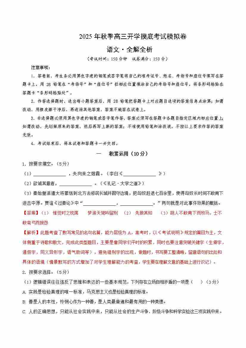 高三语文开学摸底考02(全解全析)88