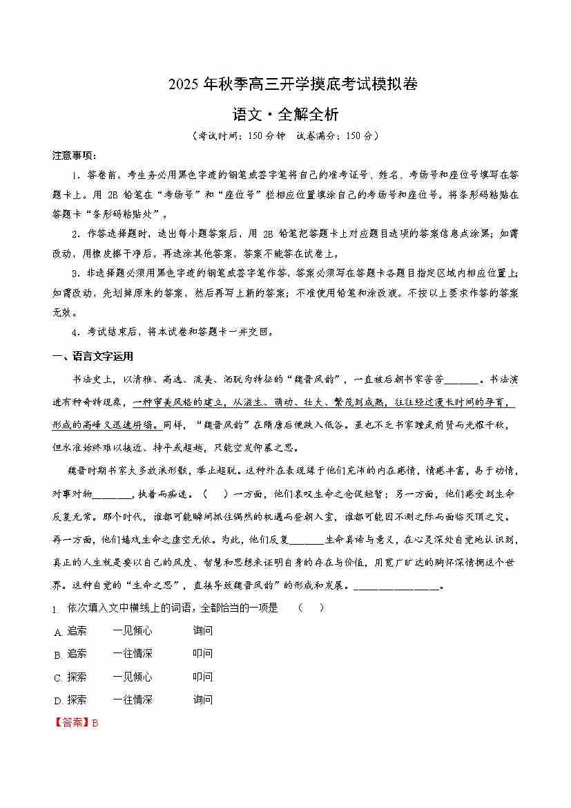 高三语文开学摸底考02(全解全析)全国一卷通用