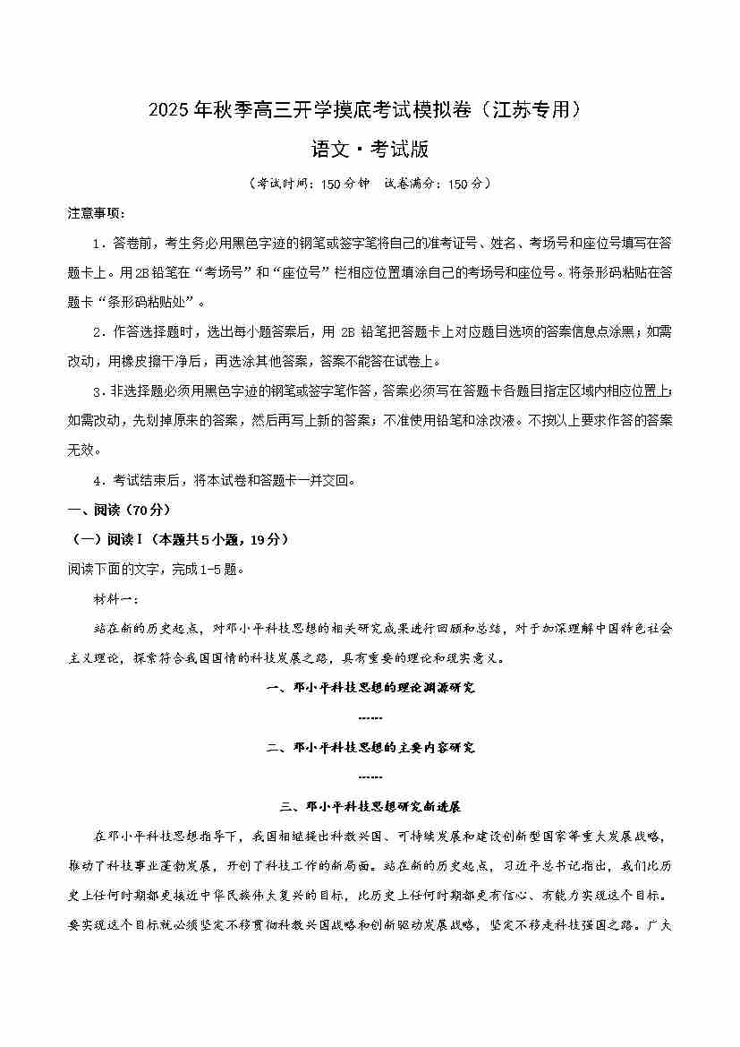 高三语文开学摸底考(江苏专用)(考试版A4)