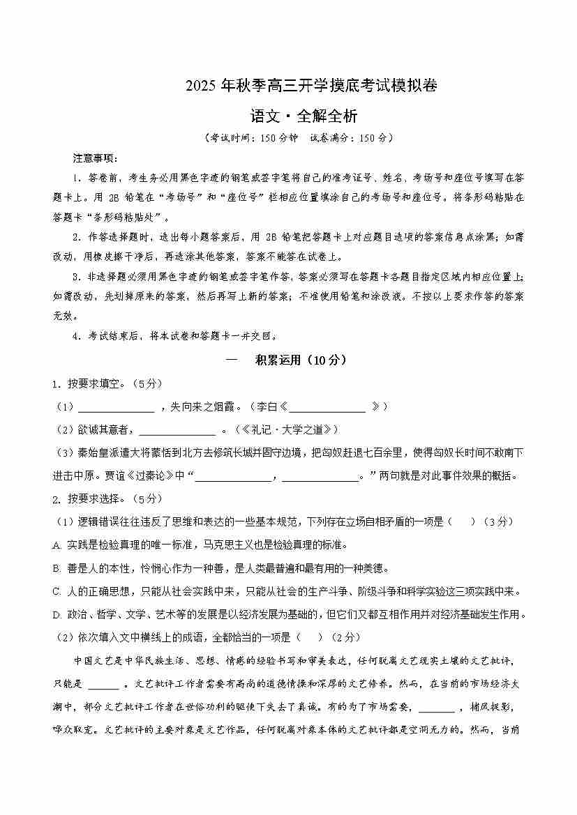 高三语文开学摸底考02(考试版A4)88