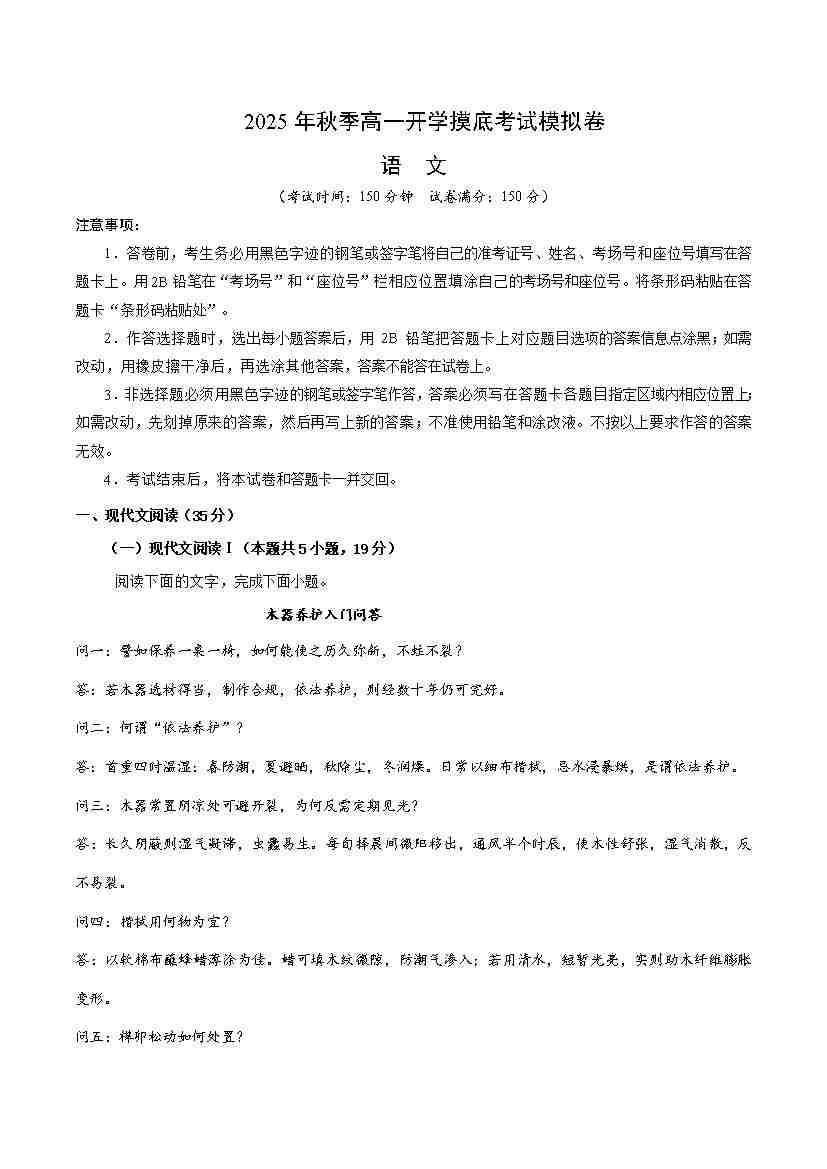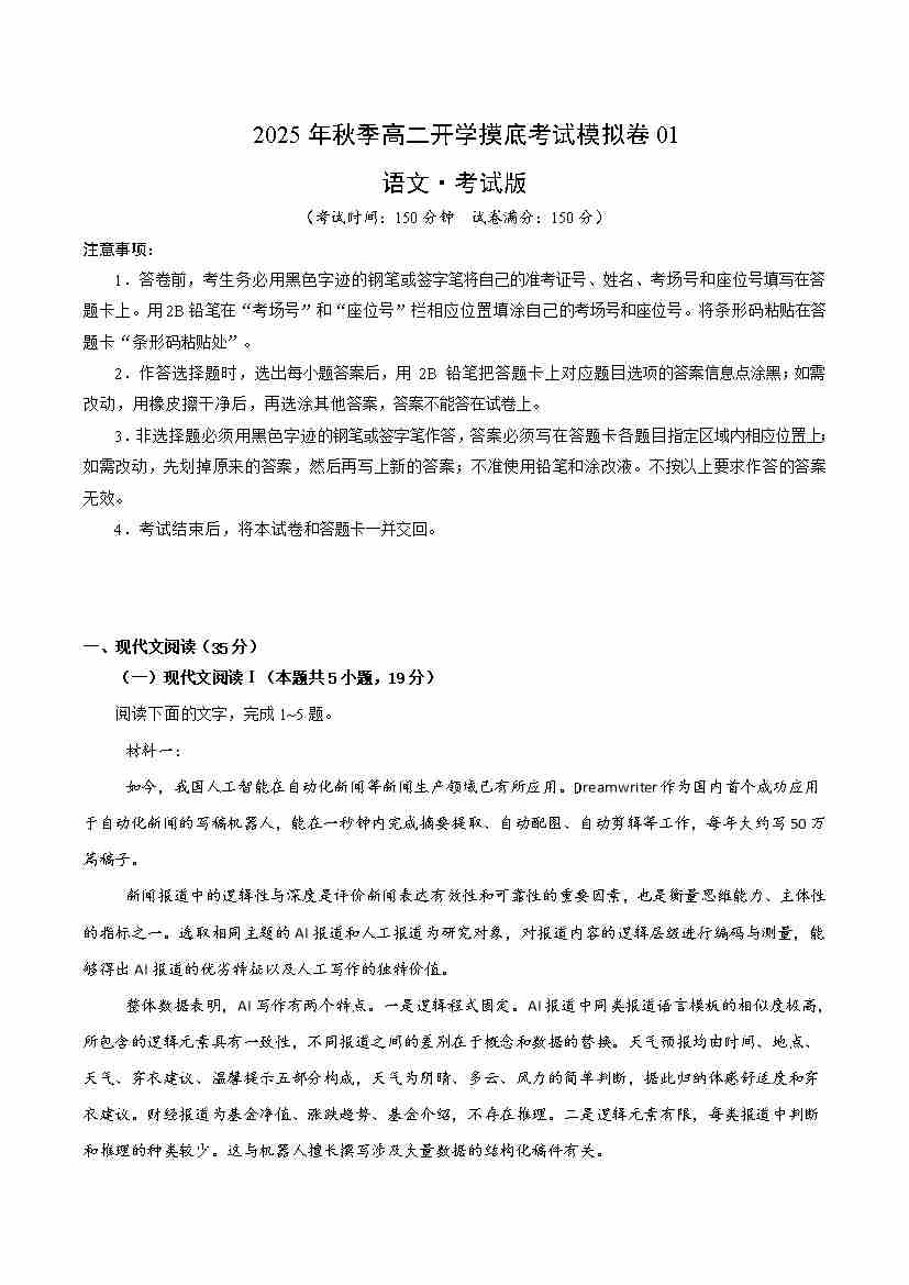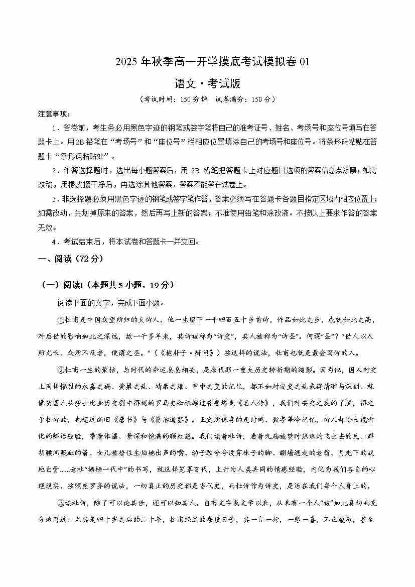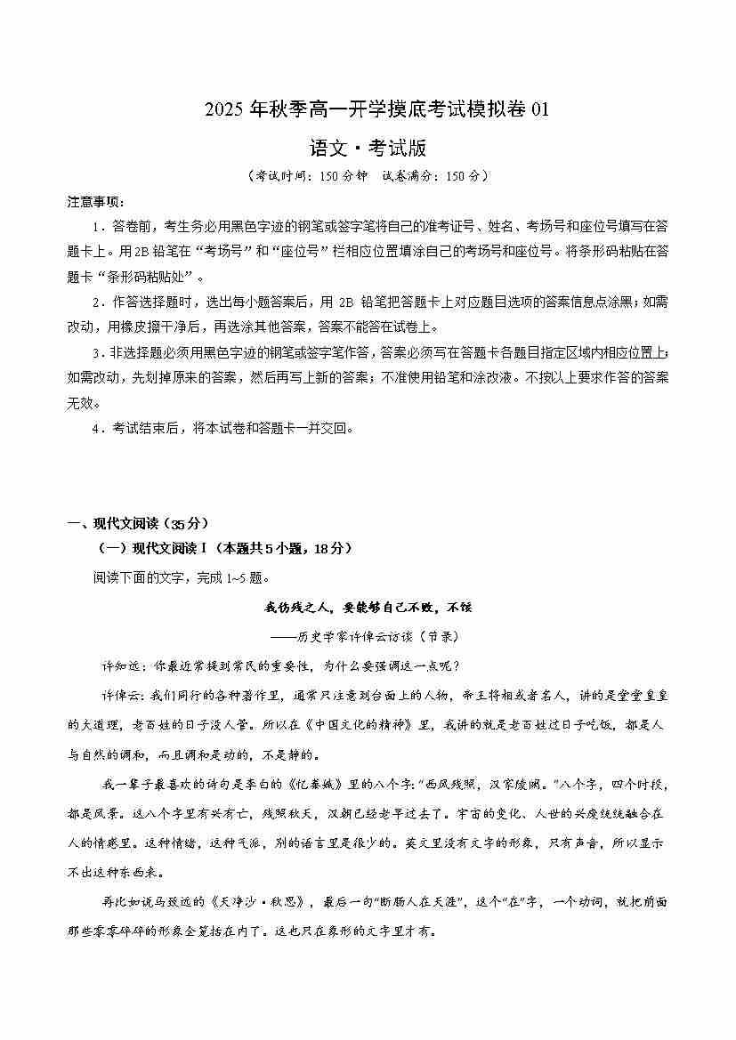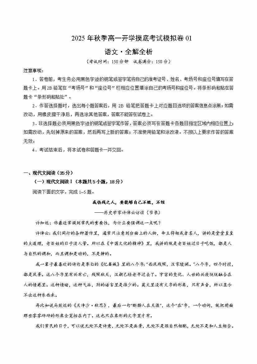 高一语文开学摸底考01(考试版A4)全国一卷