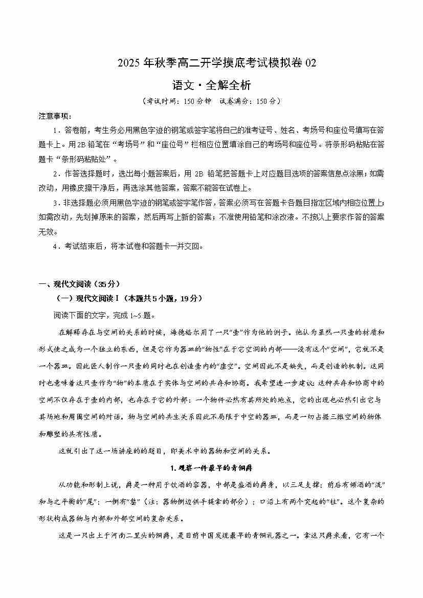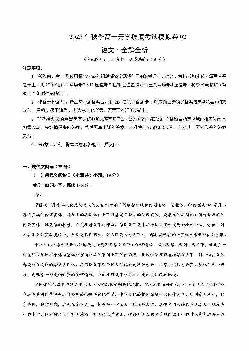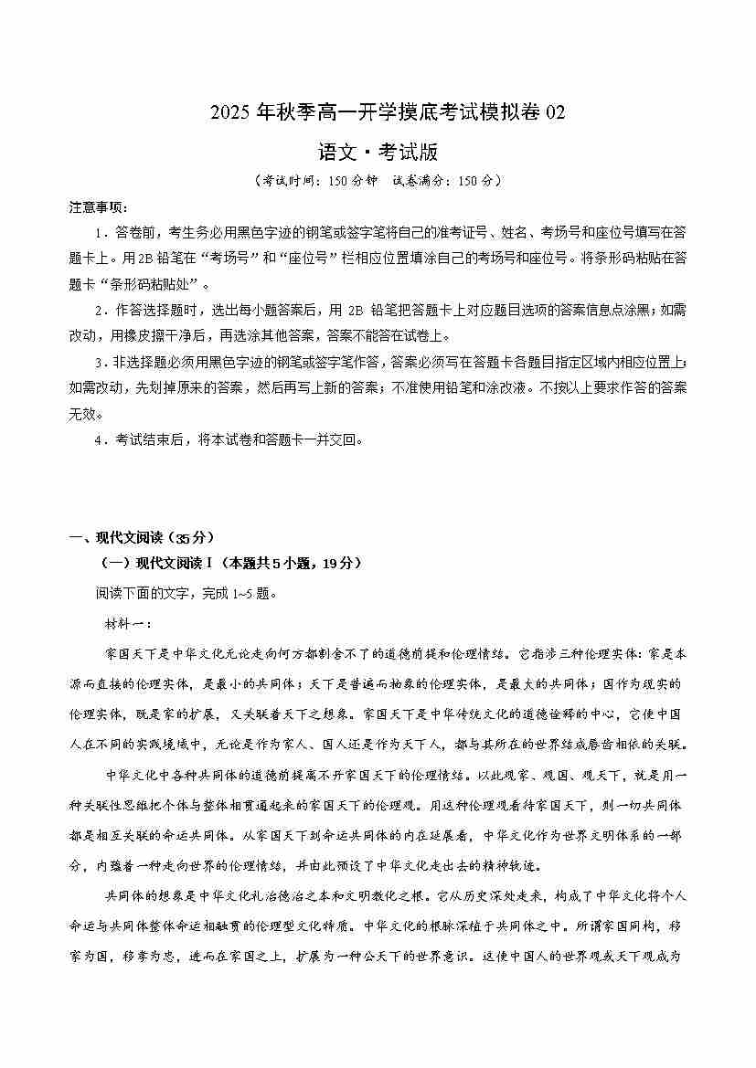 高一语文开学摸底考02(考试版A4)全国卷通用