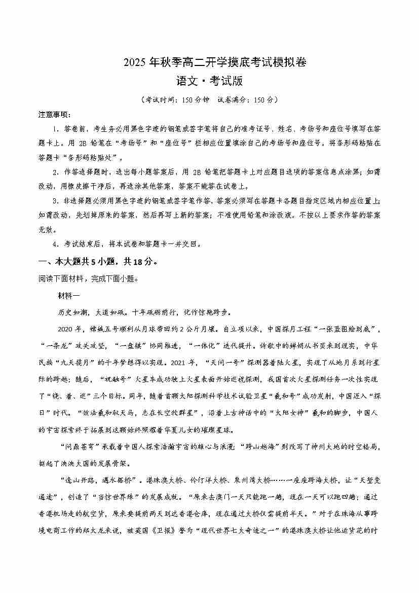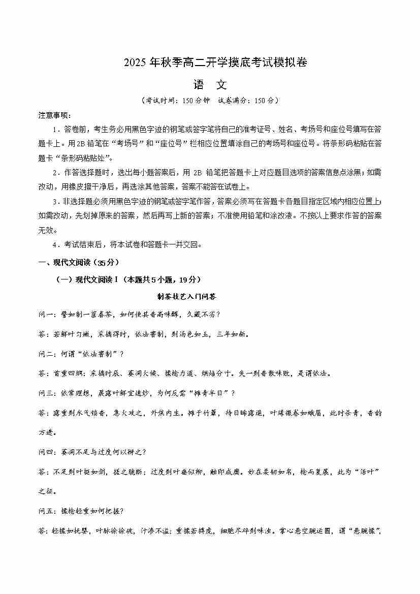 高一语文开学摸底考01(考试版A4)全国二卷