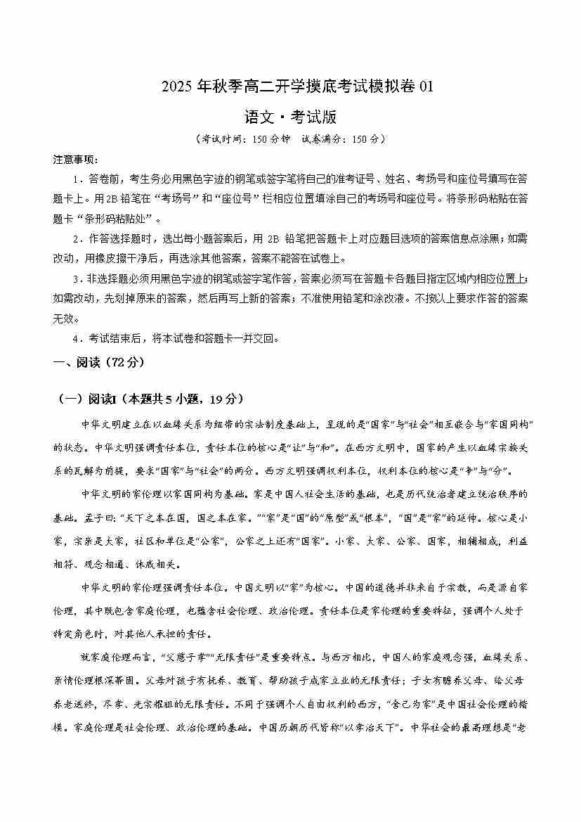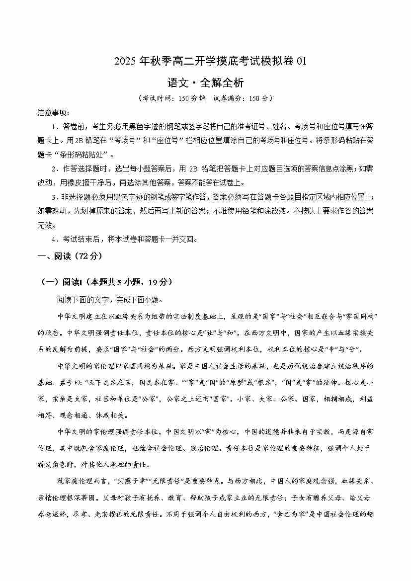 高二语文开学摸底考01(考试版A4)全国一卷