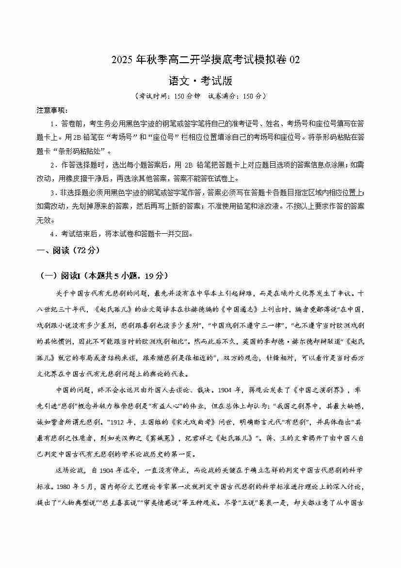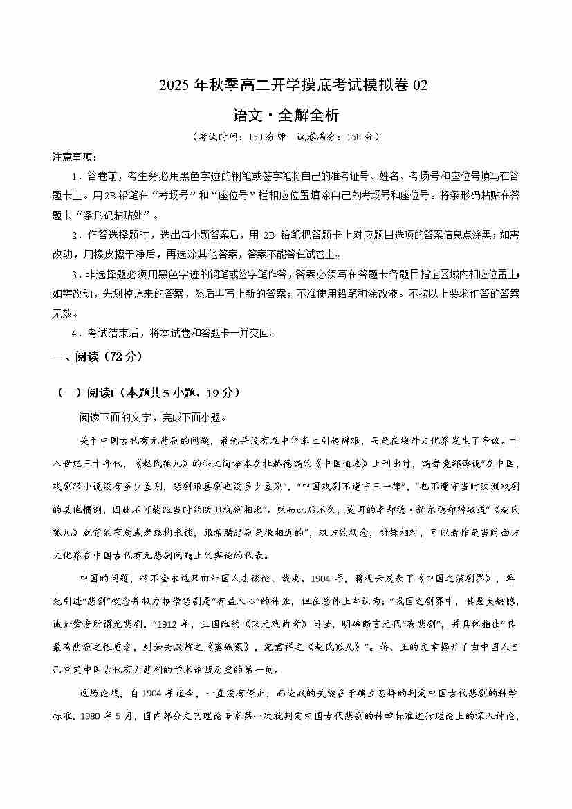 高二语文开学摸底考02(考试版A4)全国一卷通用