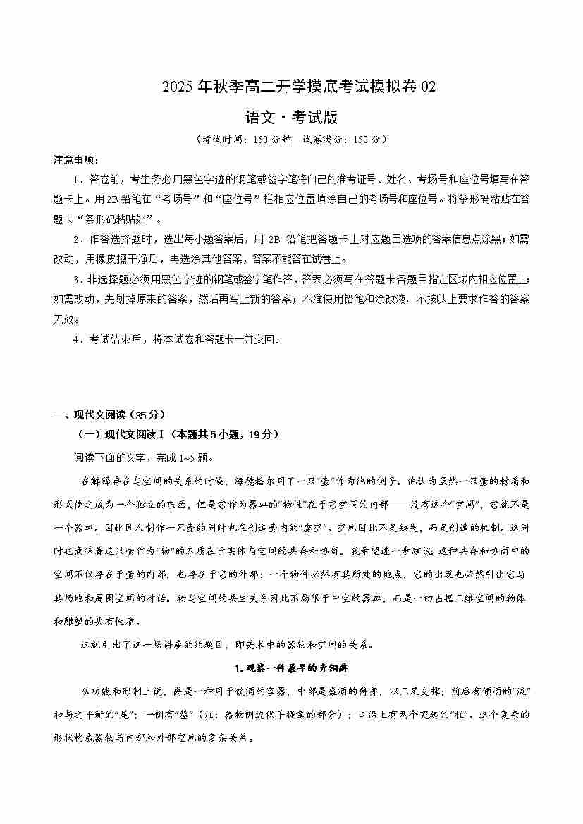 高二开学考语文(考试版A4)北京卷