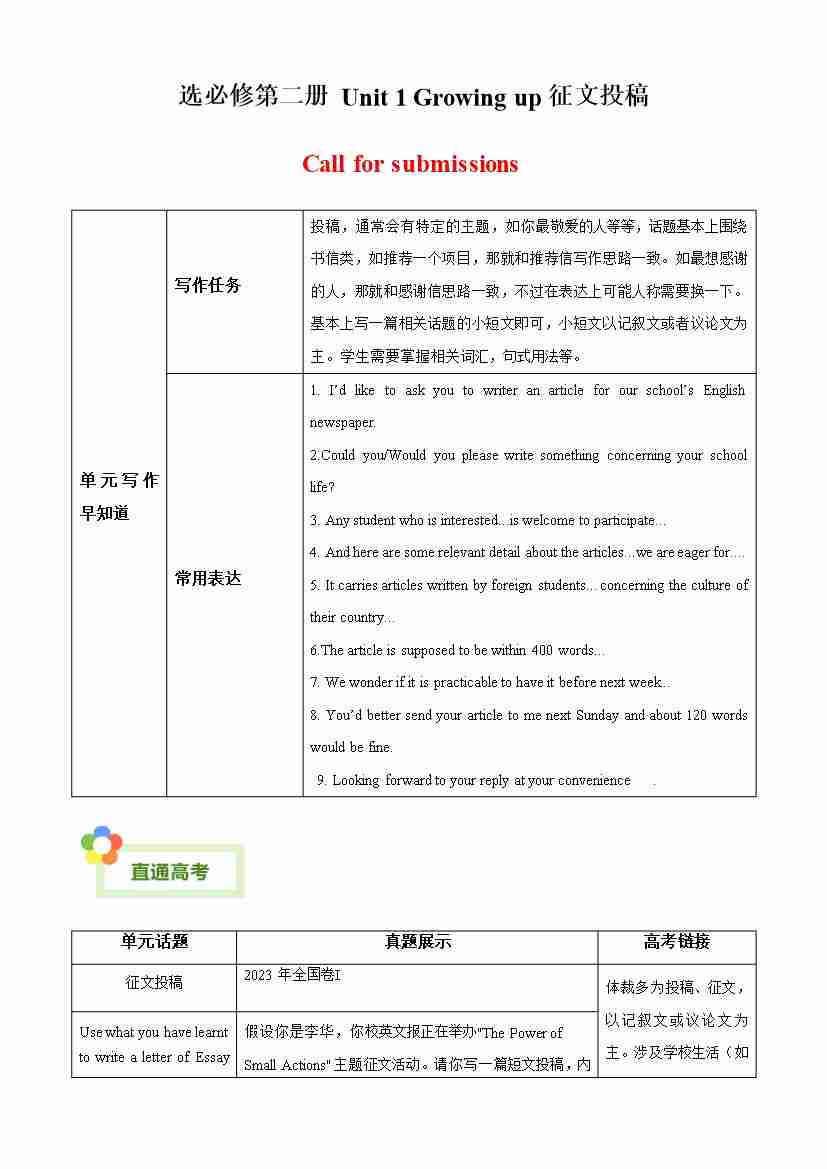 Unit 1 征文投稿(单元同步写作讲义)(教师版)