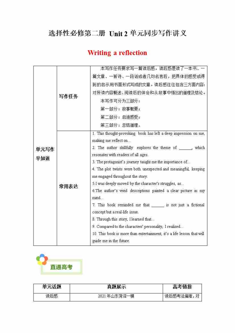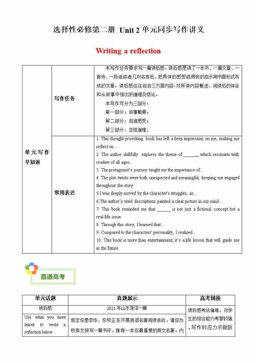 Unit 2 Improving Yourself 读后感(单元同步写作讲义)(教师版)