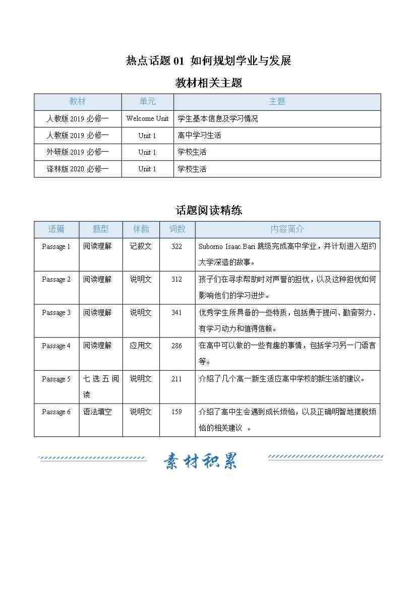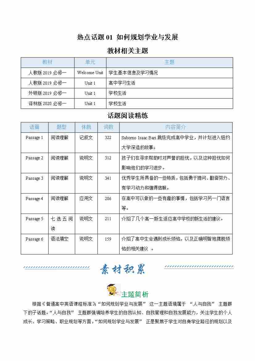 热点话题01 如何规划学业与发展(话题阅读精练)(教师版)