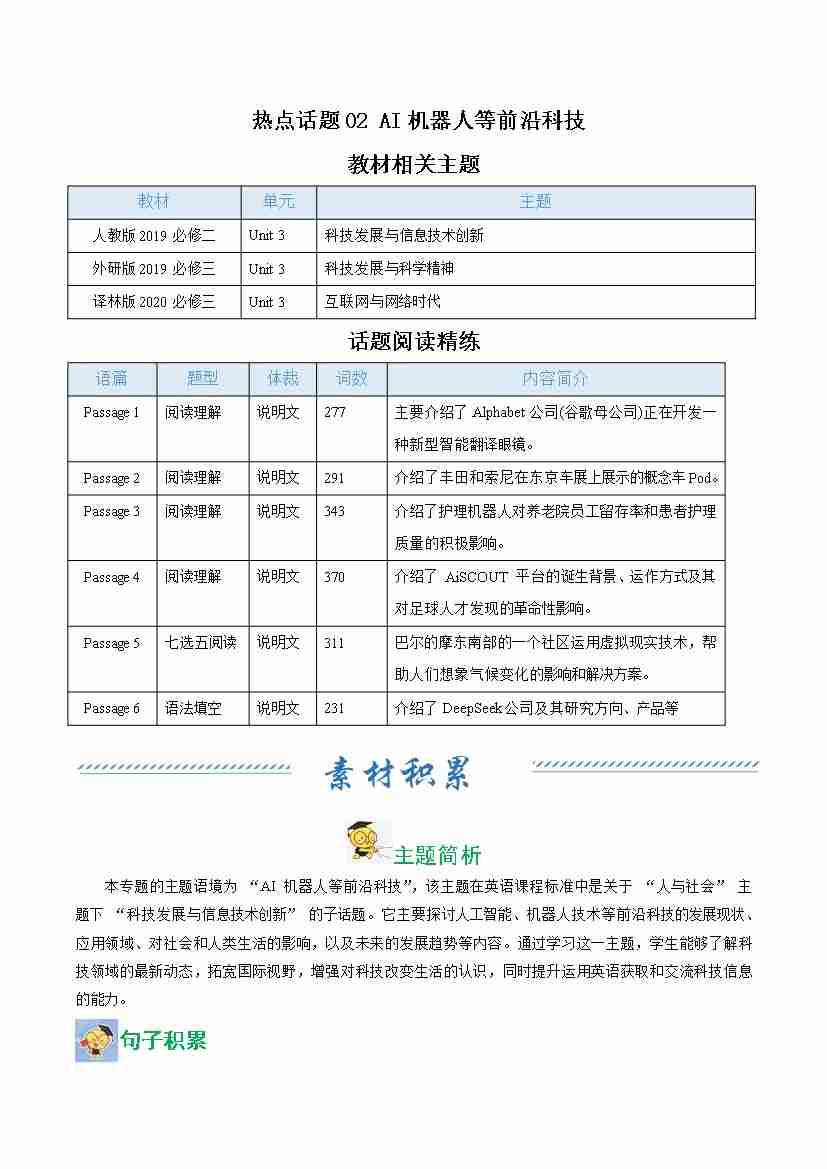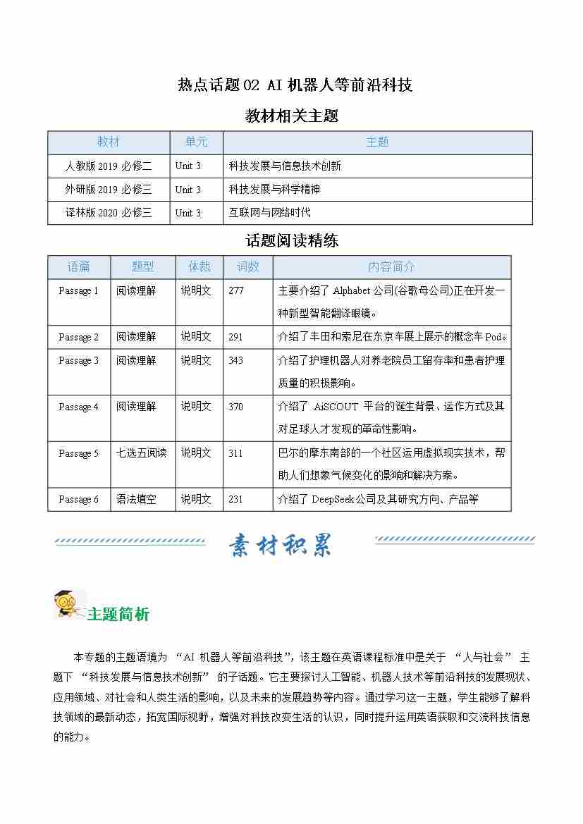 热点话题02 AI机器人等前沿科技(话题阅读精练)(学生版)