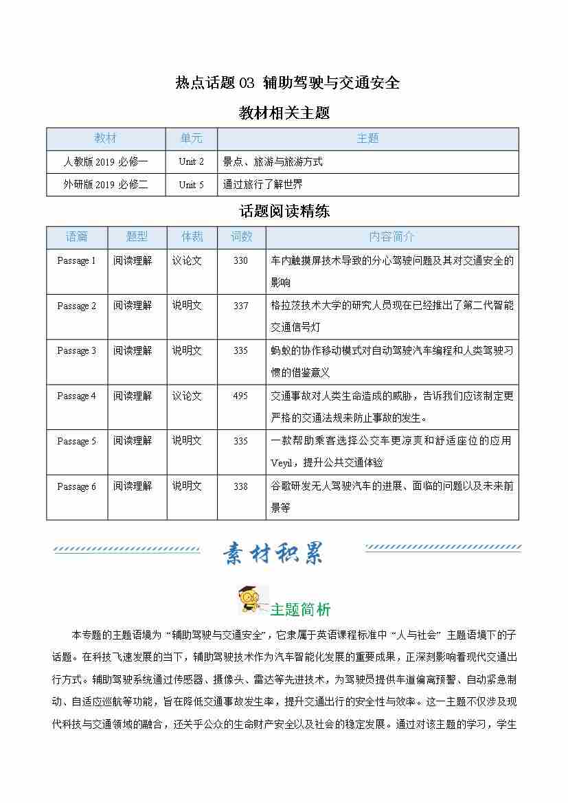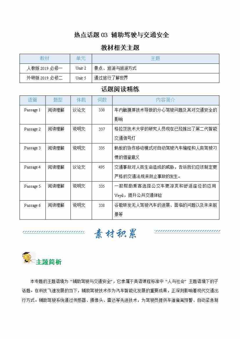 热点话题03 辅助驾驶与交通安全(话题阅读精练)(学生版)