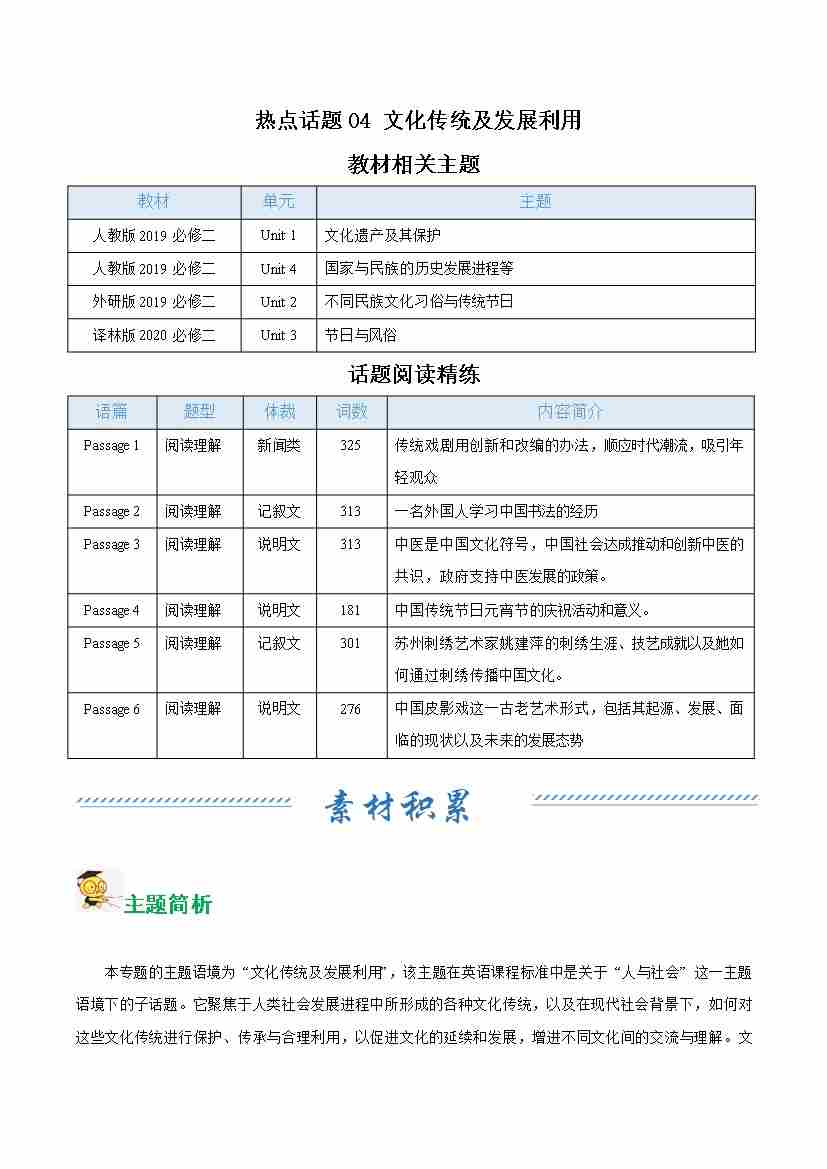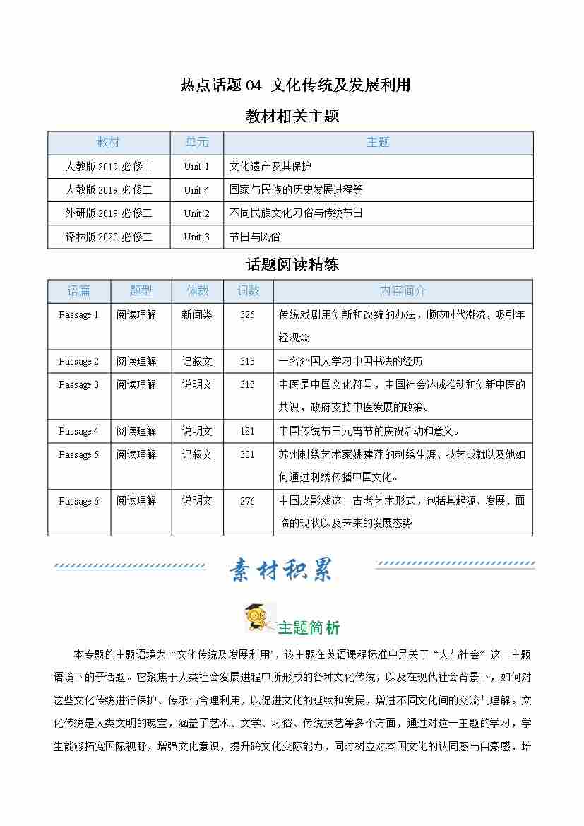 热点话题04 文化传统及发展利用(话题阅读精练)(教师版)