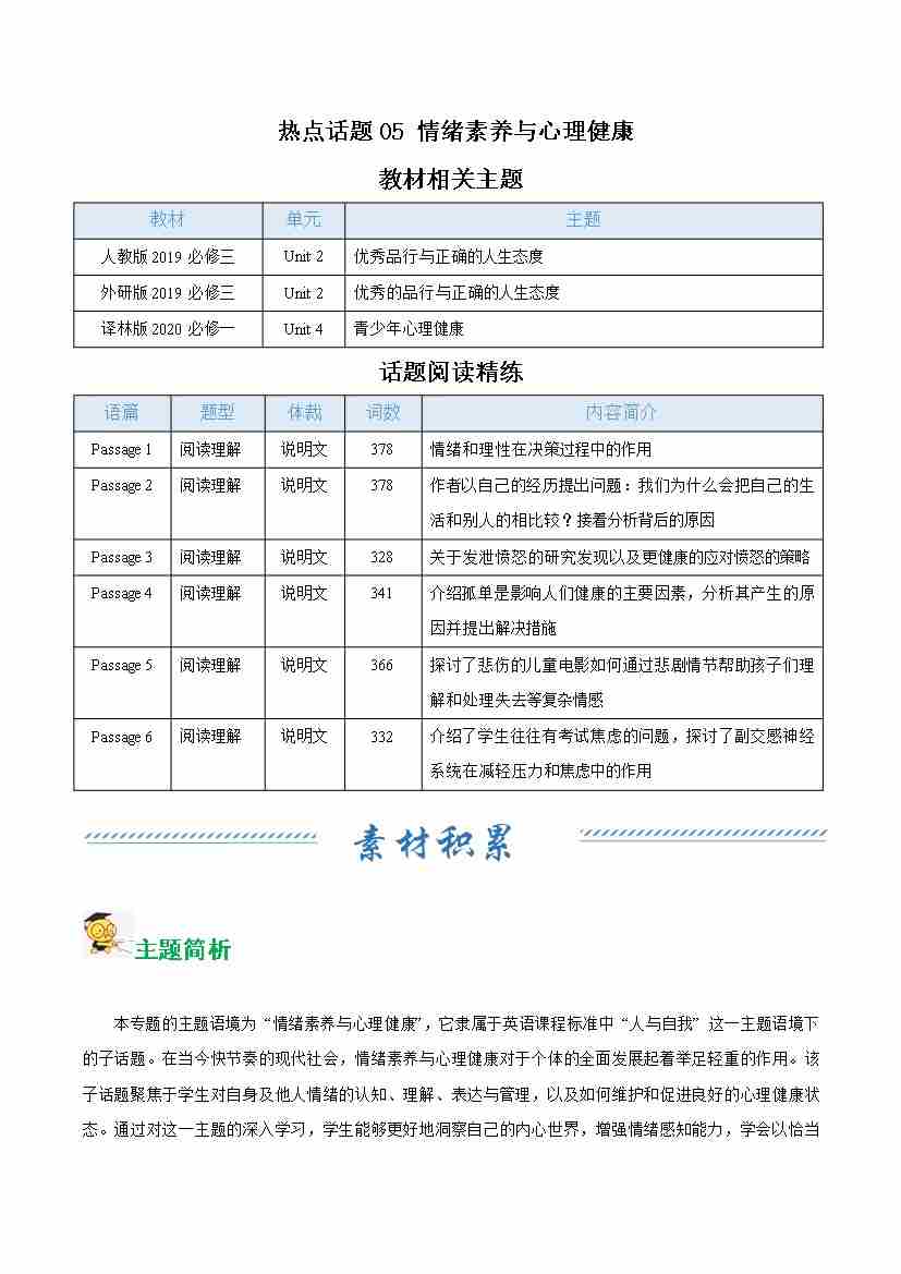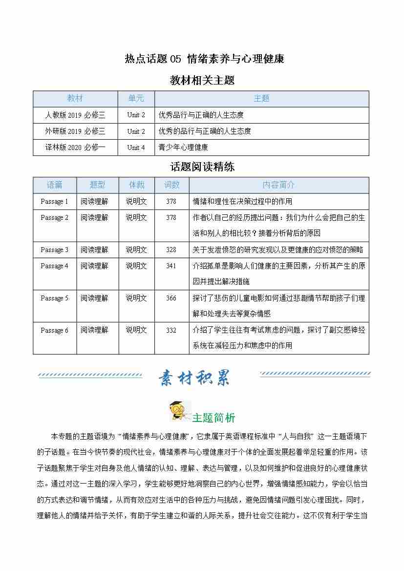热点话题05 情绪素养与心理健康(话题阅读精练)(教师版)