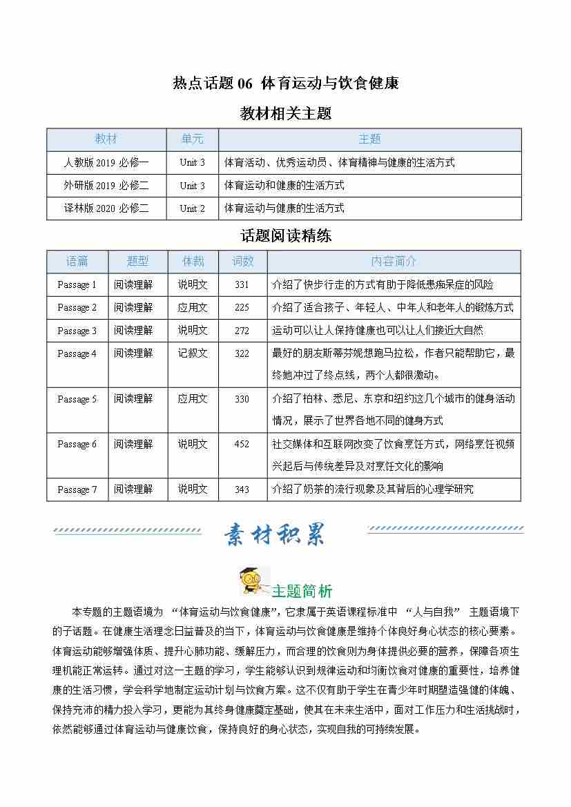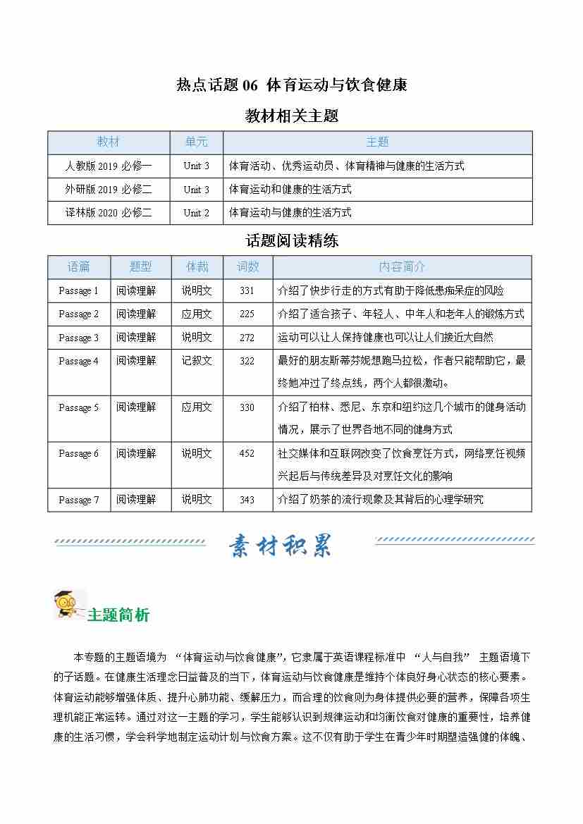热点话题06 体育运动与饮食健康(话题阅读精练)(学生版)