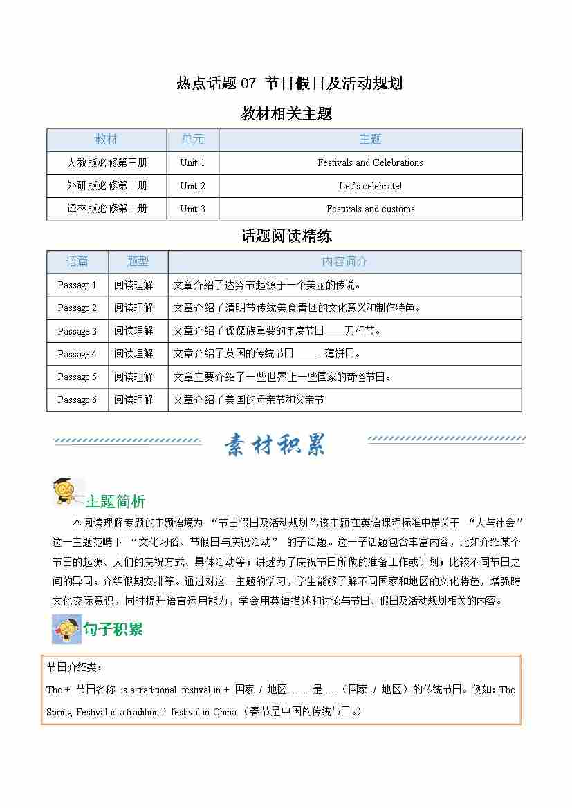 热点话题07 节日假日及活动规划(话题阅读精练)(学生版)