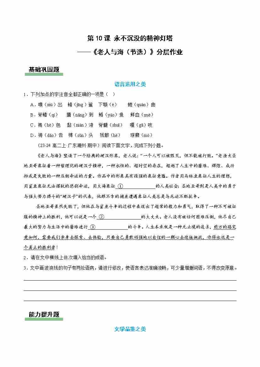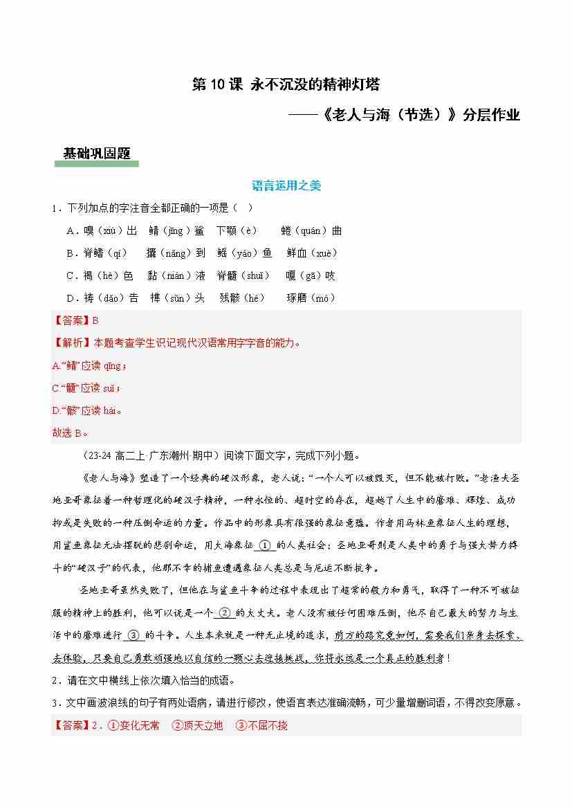 10《老人与海(节选)》(主题任务分层作业)(解析版)