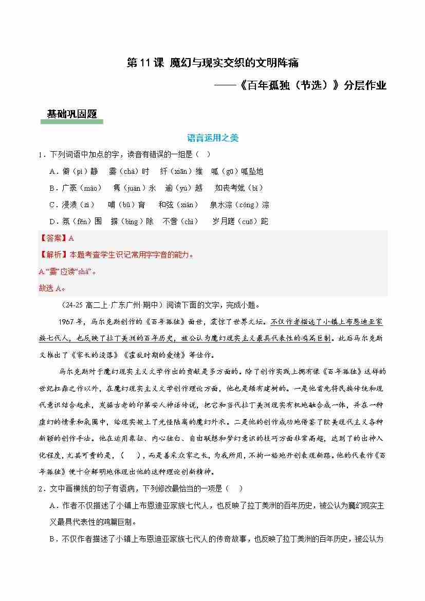 11《百年孤独(节选)》(主题任务分层作业)(解析版)