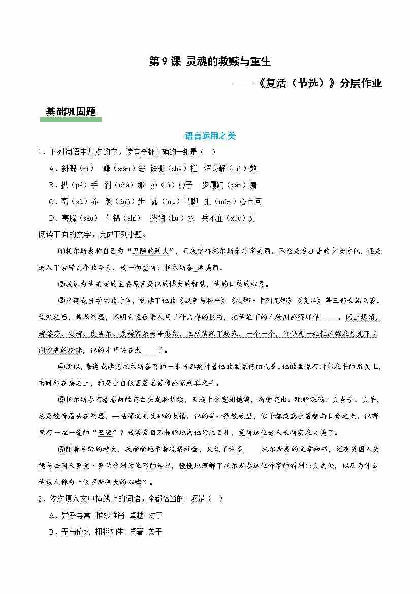 9 复活(节选):灵魂的救赎与重生(主题任务分层作业)(原卷版)
