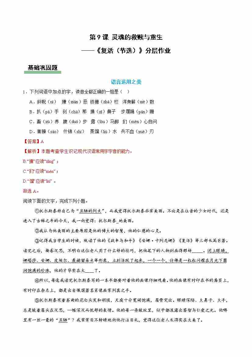9 复活(节选):灵魂的救赎与重生(主题任务分层作业)(解析版)