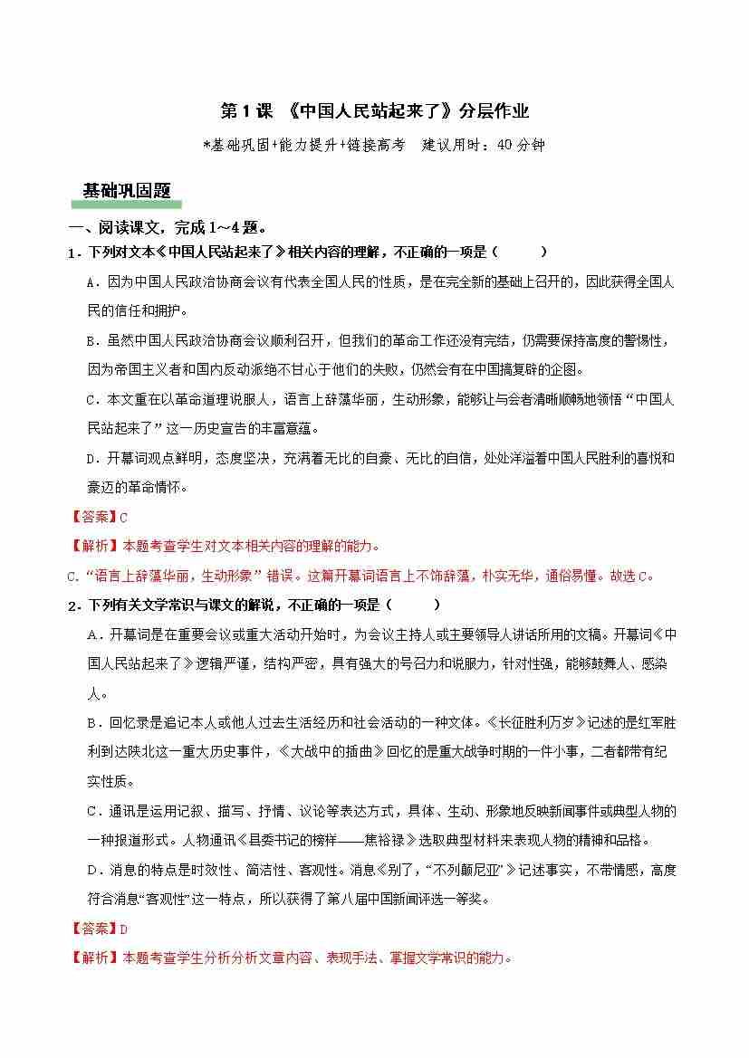 《在民族复兴的历史丰碑上——2020中国抗疫记》分层作业(解析版)