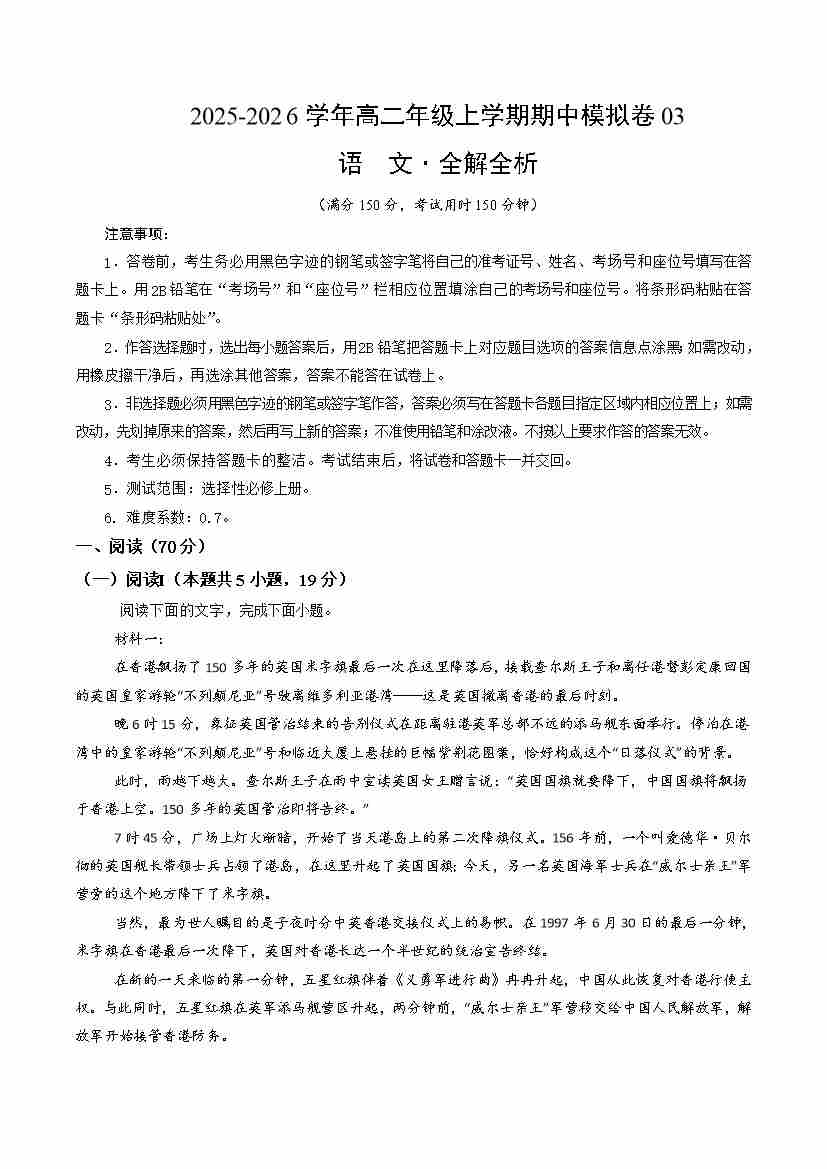 高二语文上学期期中模拟卷03(统编版)(全解全析)