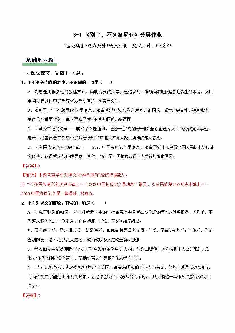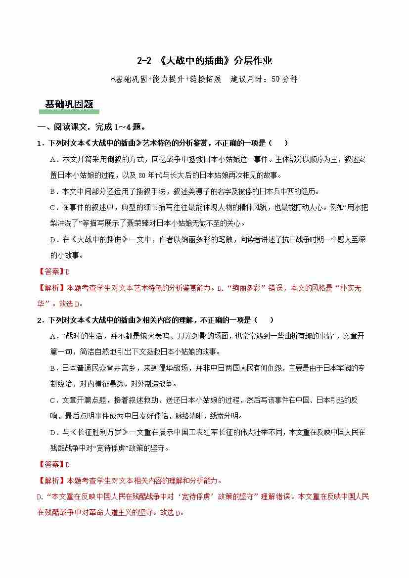 《大战中的插曲》分层作业(解析版)