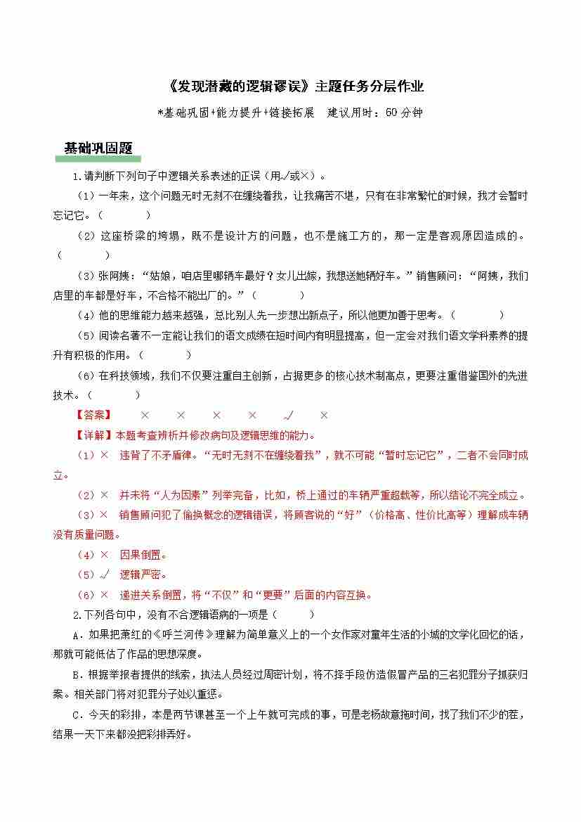 《发现潜藏的逻辑谬误》(分层作业)(解析版)