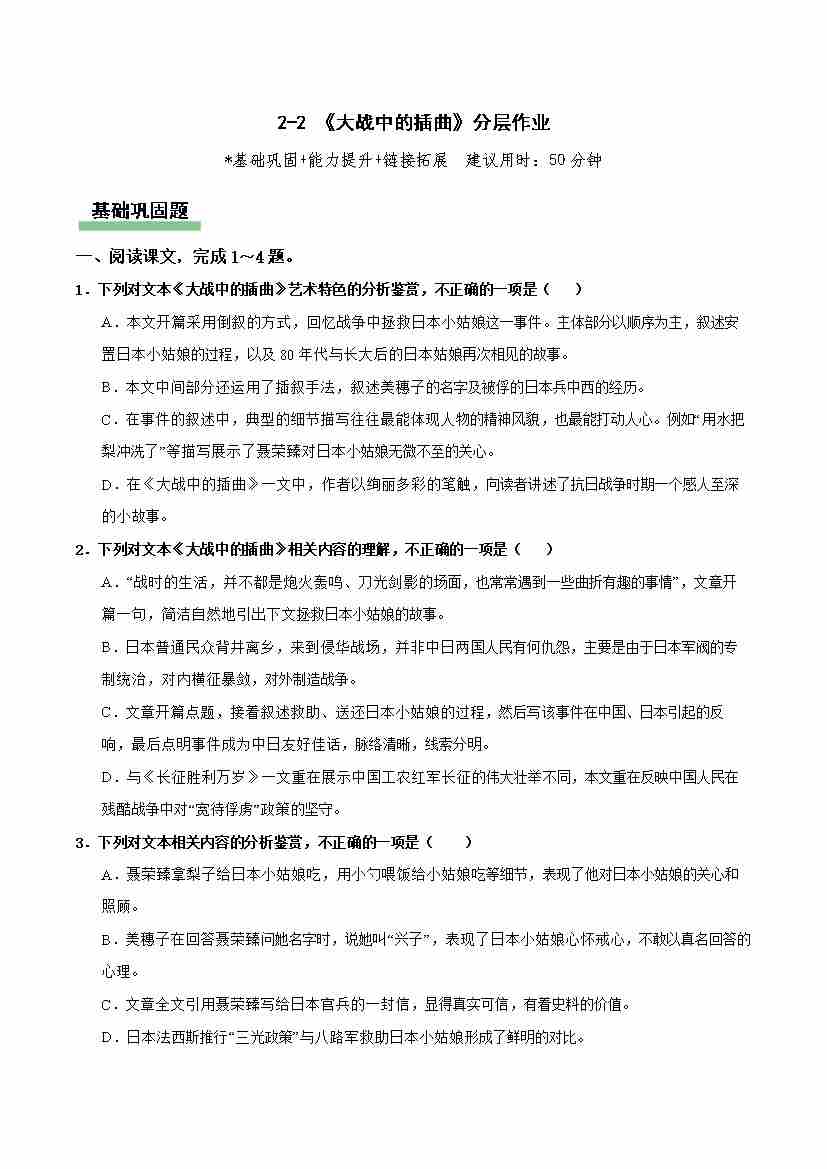 《大战中的插曲》分层作业(原卷版)