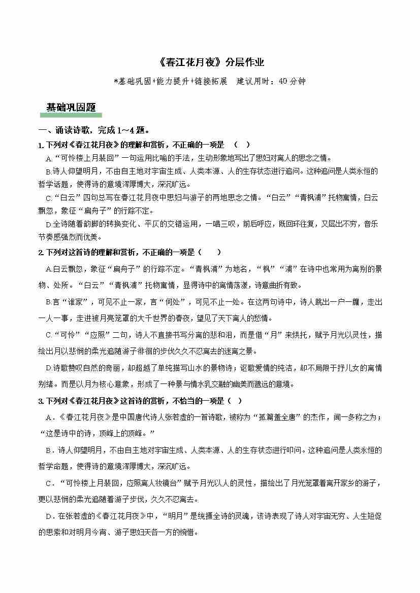 《春江花月夜》(主题任务式分层作业)(原卷版)