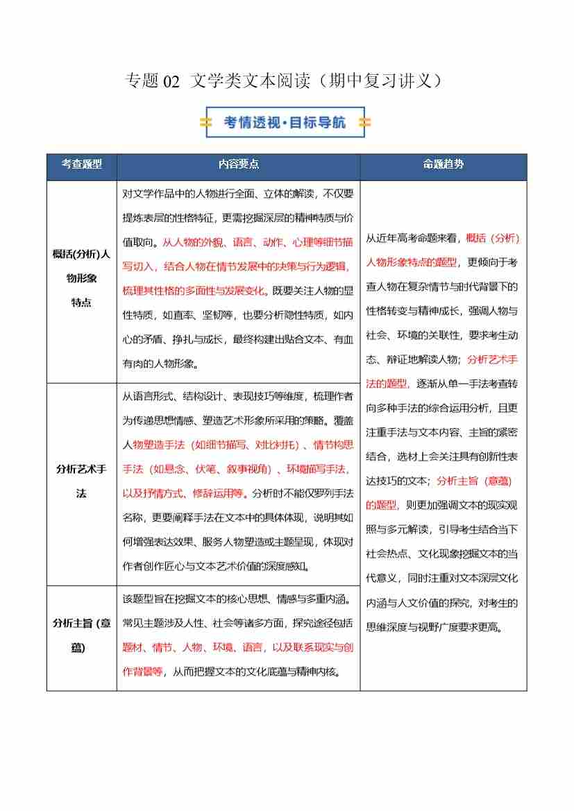 专题02 文学类文本阅读(期中复习讲义)(教师版)