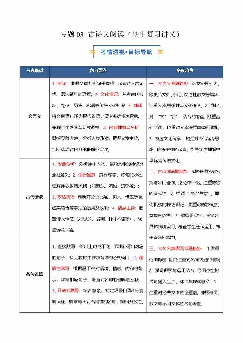 专题03 古诗文阅读(期中复习讲义)(学生版)