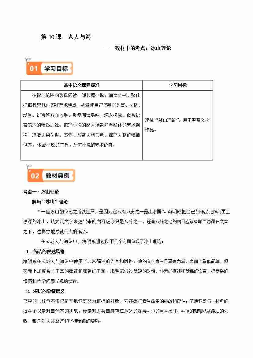 第10课 老人与海(教材中的考点:冰山理论 )(学生版)