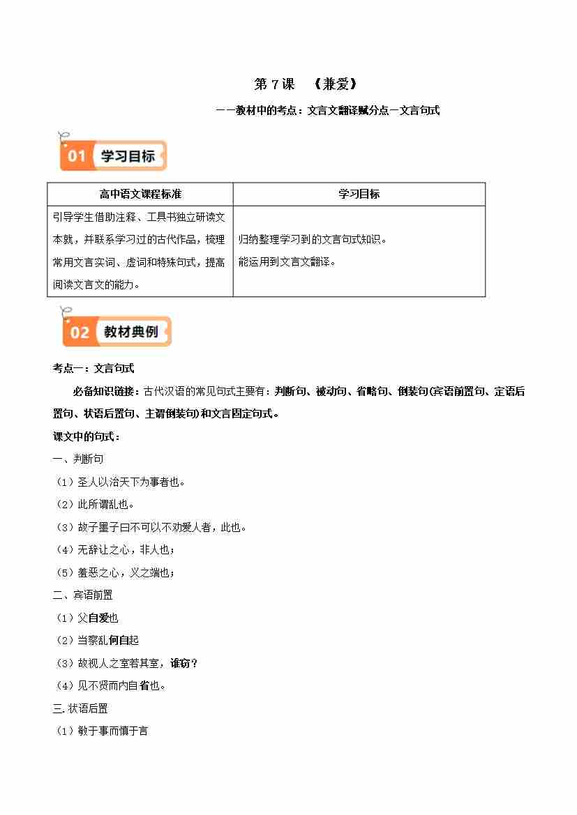 第7课 兼爱(教材中的考点:文言文翻译之文言句式)(学生版)
