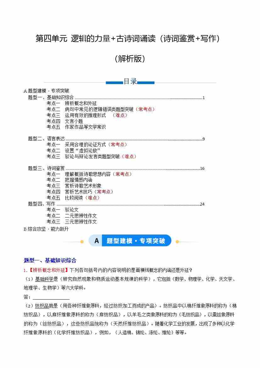 第四单元 逻辑的力量(含古诗词诵读)(专项训练)(解析版)