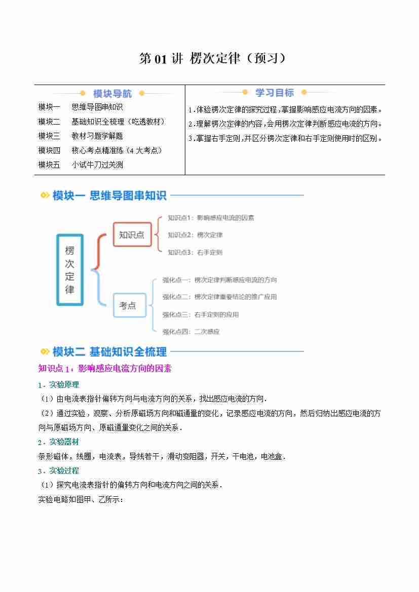 ②寒假预习-第01讲 楞次定律(3知识点、4考点)(学生版)2025年高二物理寒假衔接讲练 (人教版)