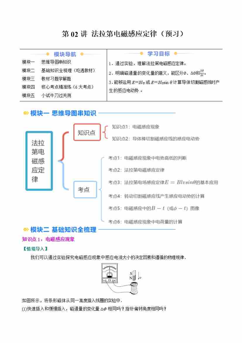 ②寒假预习-第02讲 法拉第电磁感应定律(2知识点、6考点)(学生版)2025年高二物理寒假衔接讲练 (人教版)