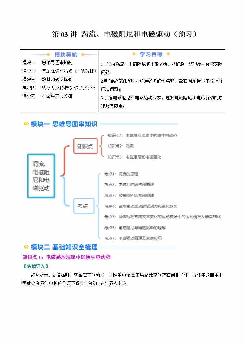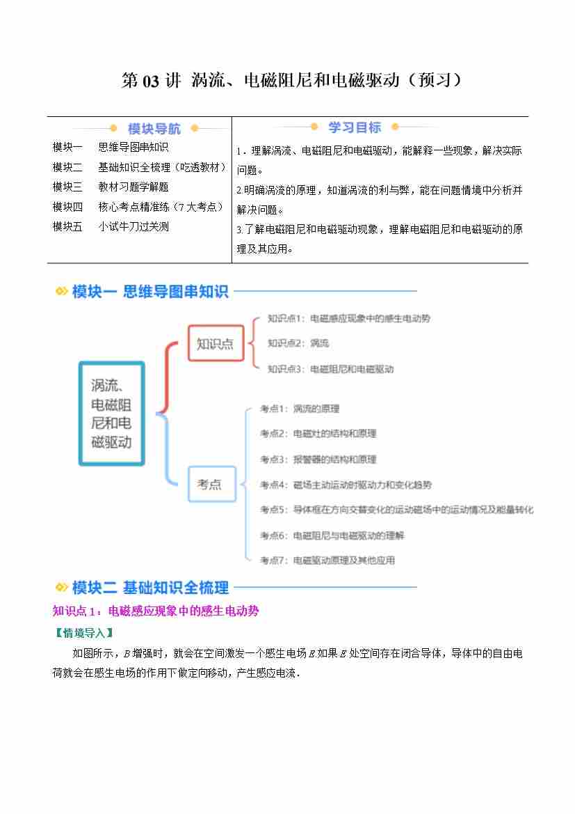 ②寒假预习-第03讲 涡流、电磁阻尼和电磁驱动(3知识点、7考点)(学生版)2025年高二物理寒假衔接讲练 (人教版)
