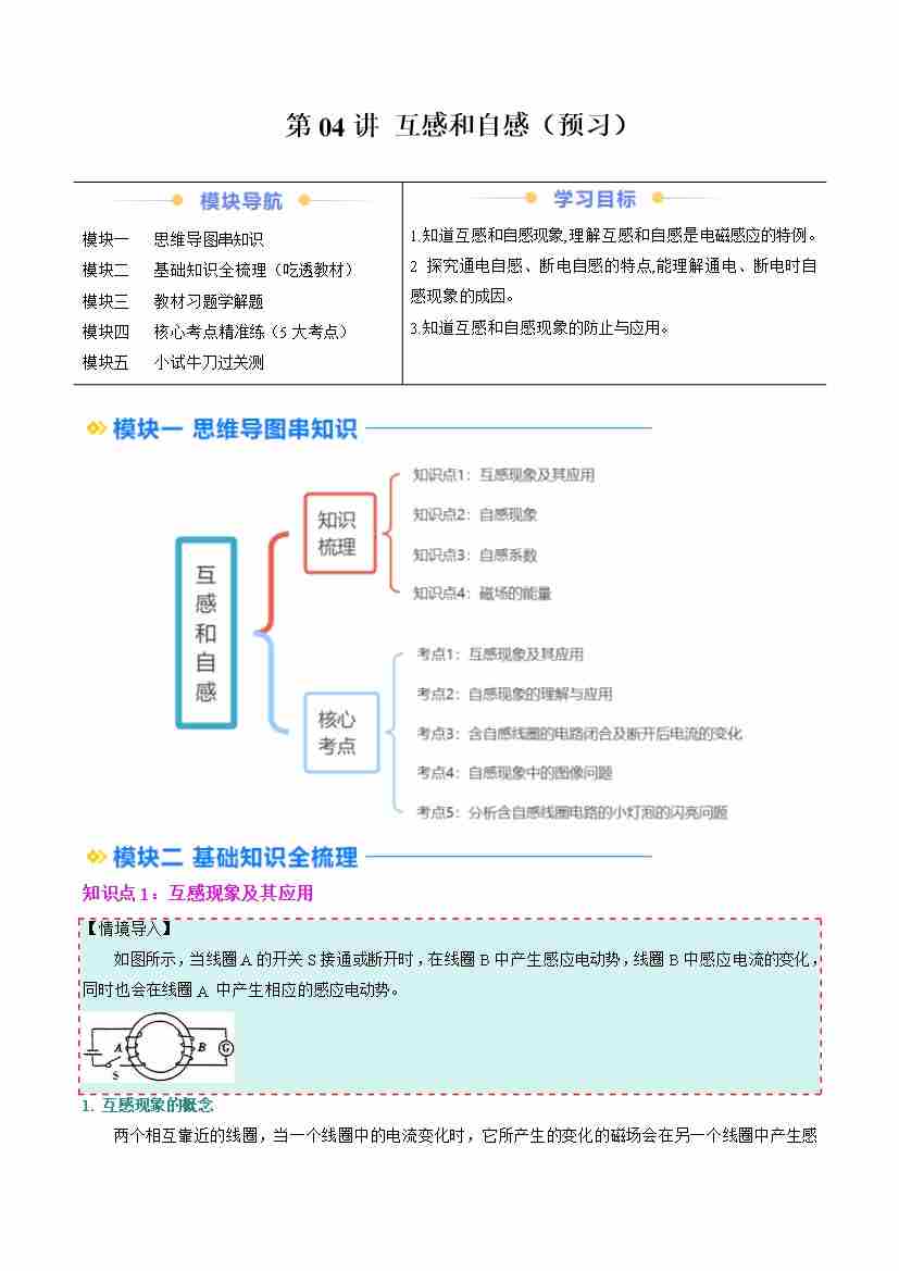 ②寒假预习-第04讲 互感和自感(4知识点、5考点)(学生版)2025年高二物理寒假衔接讲练 (人教版)