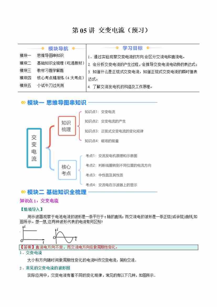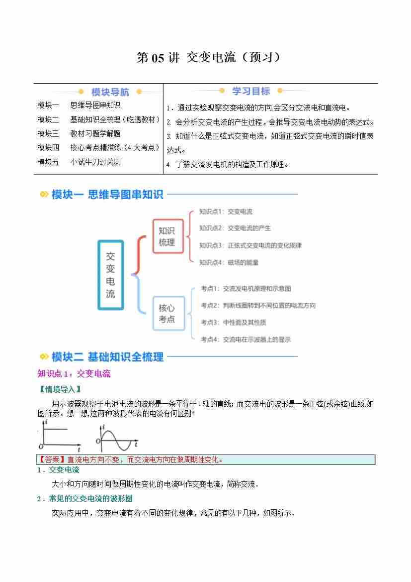 ②寒假预习-第05讲 交变电流(4知识点、7考点)(学生版)2025年高二物理寒假衔接讲练 (人教版)