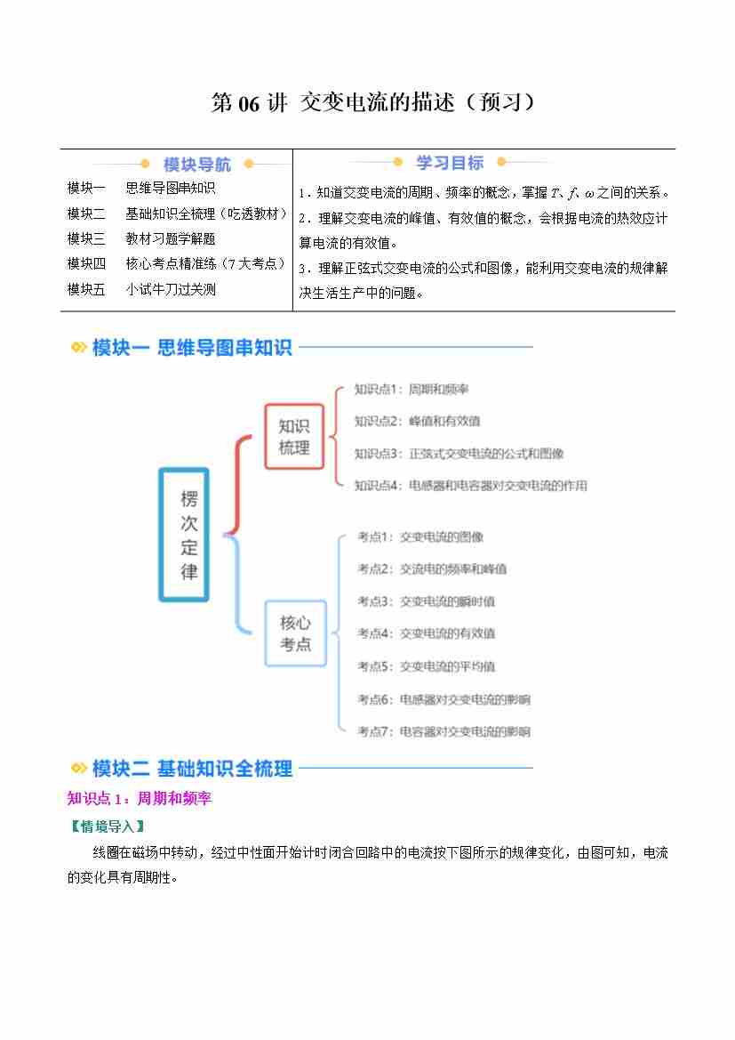 ②寒假预习-第06讲 交变电流的描述(4知识点、7考点)(学生版)2025年高二物理寒假衔接讲练 (人教版)