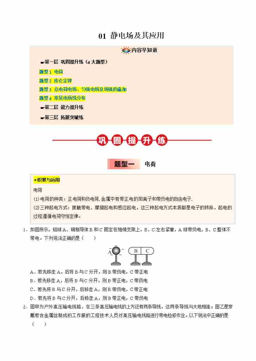 ③寒假提升练-01 静电场及其应用(学生版)2025年高二物理寒假衔接讲练 (人教版)