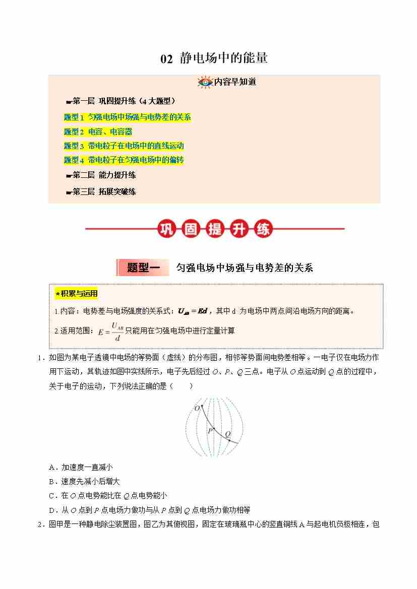 ③寒假提升练-02 静电场中的能量(学生版)2025年高二物理寒假衔接讲练 (人教版)
