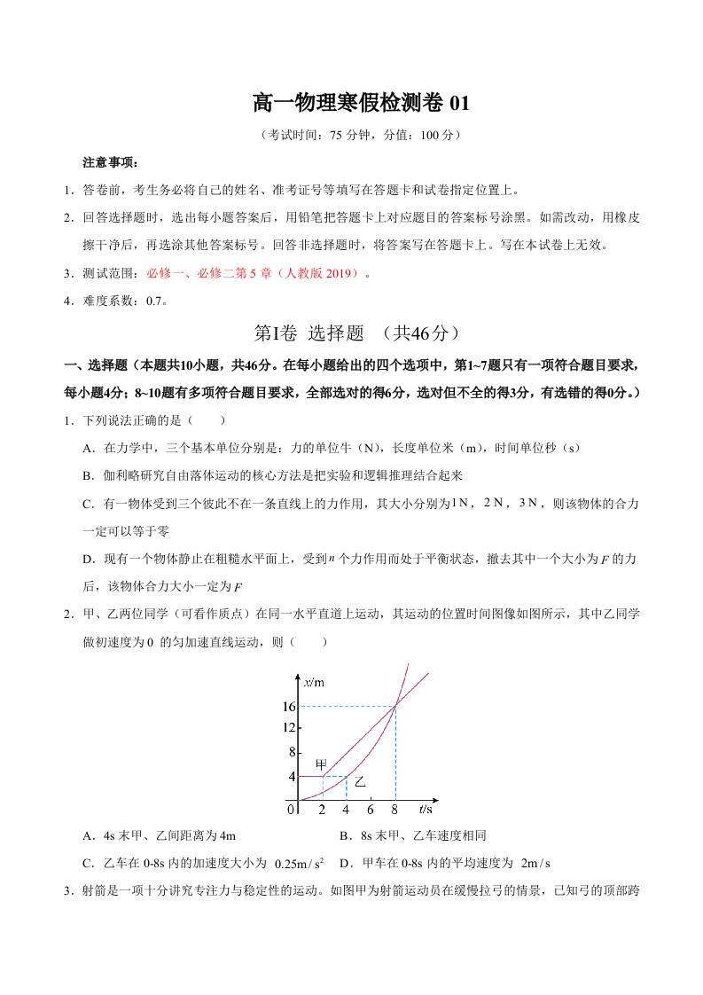 高一物理寒假检测卷01(学生版)2025年高一物理寒假衔接讲练 (人教版)