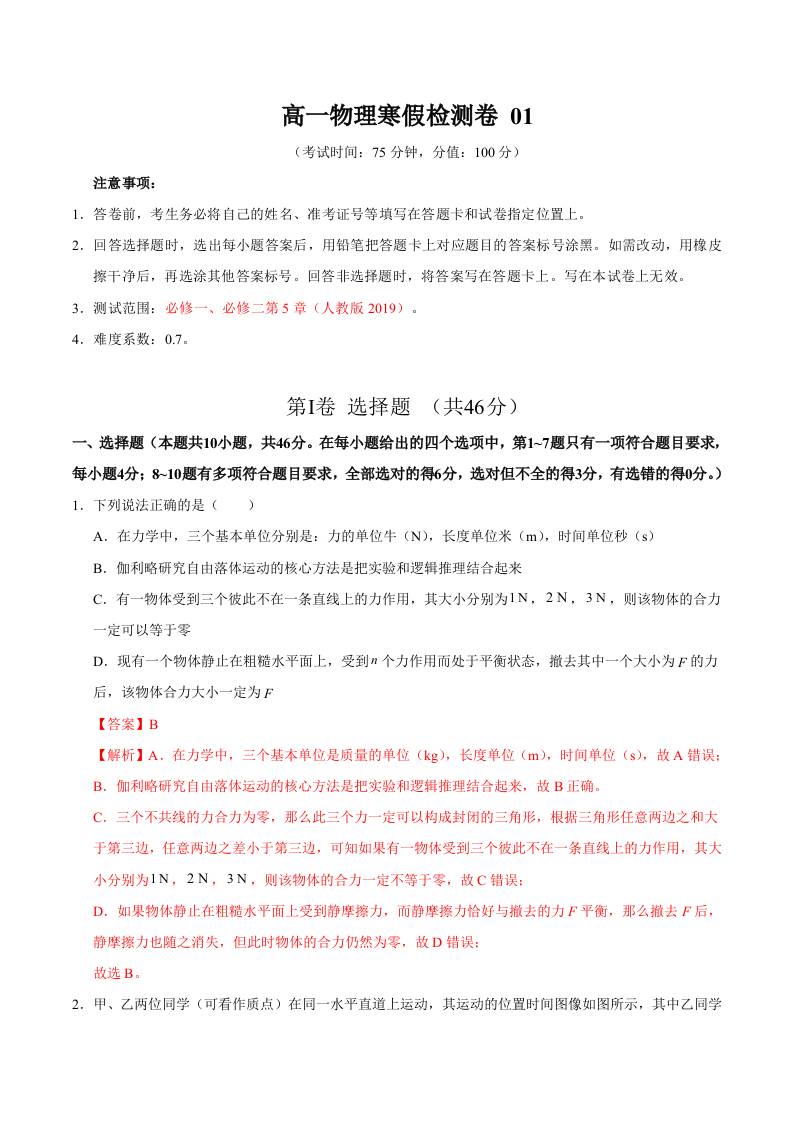 高一物理寒假检测卷01(教师版)2025年高一物理寒假衔接讲练 (人教版)