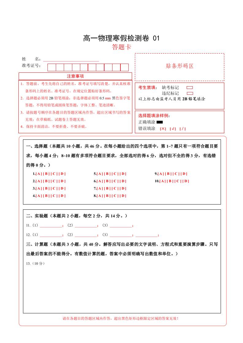 高一物理寒假检测卷01(答题卡)2025年高一物理寒假衔接讲练 (人教版)