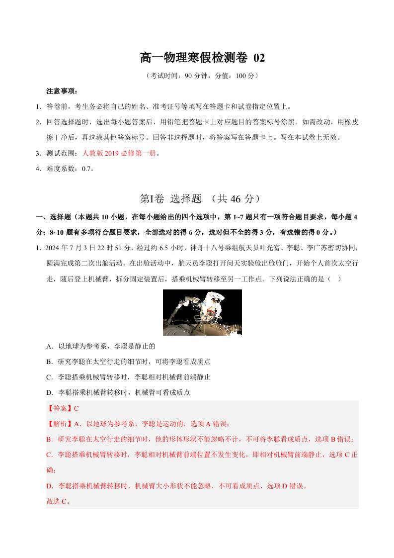 高一物理寒假检测卷02(教师版)2025年高一物理寒假衔接讲练 (人教版)