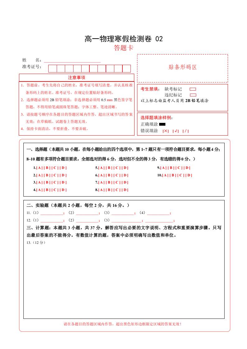 高一物理寒假检测卷02(答题卡)2025年高一物理寒假衔接讲练 (人教版)