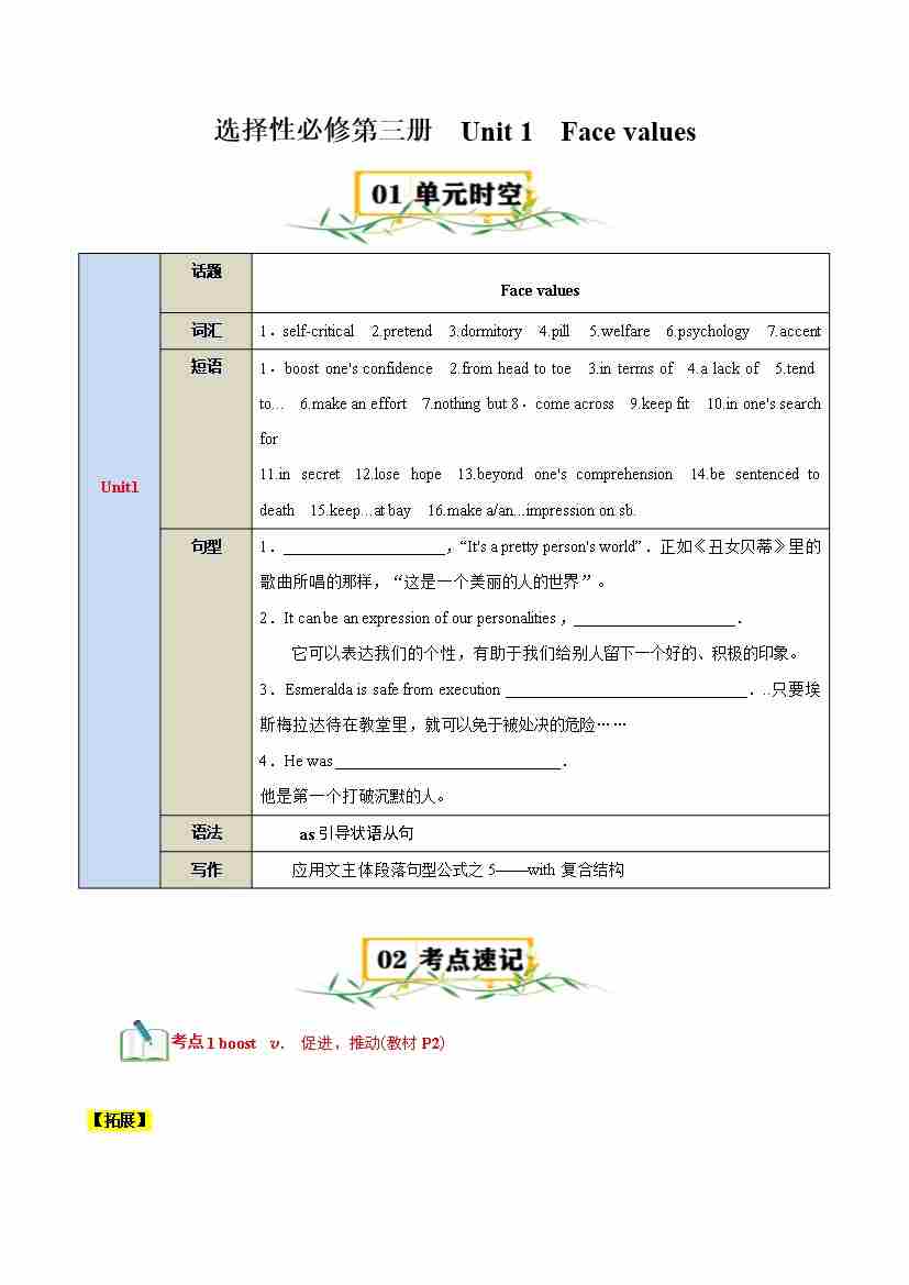 选择性必修第三册 Unit 1 Face values(知识清单)(外研版2019)(教师版)