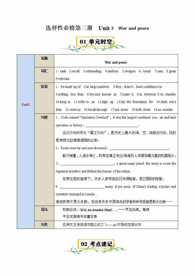 选择性必修第三册 Unit 3 War and peace(知识清单)(教师版)